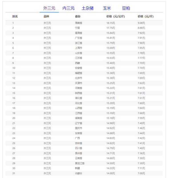 全国外三元猪价格排行榜