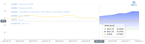 玄田算法是由项目课题组团队原创的非经典逻辑数值聚合理论和不确定性预测方法,构建了基于一致模算子的生猪价格预测模型。该模型采用的聚合函数及一致模相关理论与方法已获得多项国家自然科学基金和省级自然科学资金资助,并获得多项省级自然科学奖奖项。04月07日预测猪价为14.7607,置信区间在14.2559--15.2755之间。04月08日预测猪价为14.6761;04月09日预测猪价为14.6094。