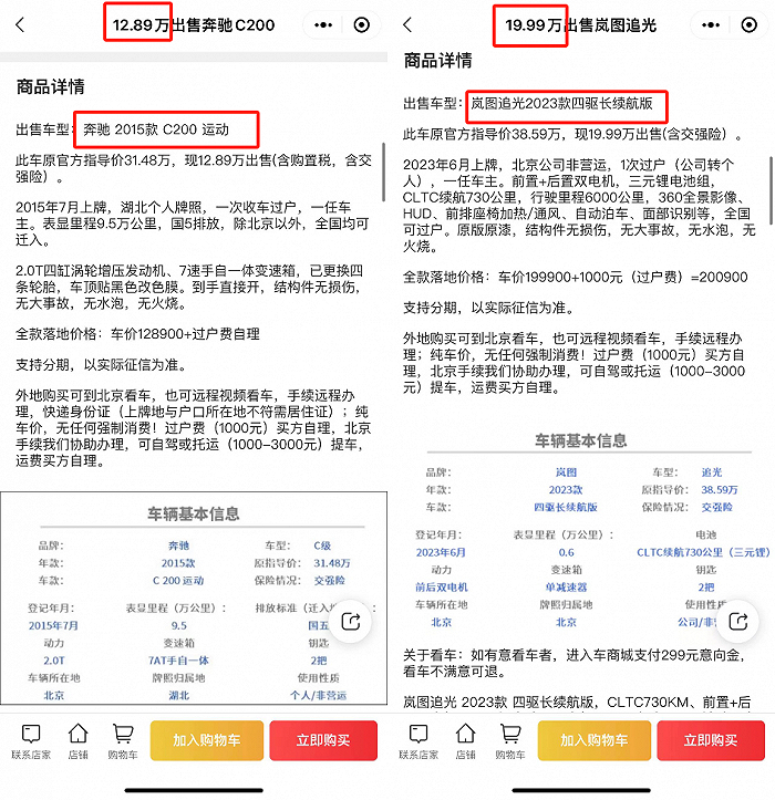 在一个名为“大飙车”的二手车小程序里,记者看到,一辆2015年的奔驰C200(燃油车),开了将近10年,里程9.5万公里,售价为12.89万元,原官方指导价是31.48万元。而一款2023年款岚图追光(纯电车),2023年6月上牌,里程6000公里,官方指导价为38.59万元,现售价为19.99万元,9个月降幅几近五成。