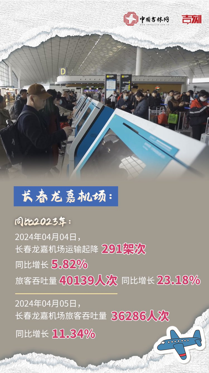 长春龙嘉机场是吉林省最重要的机场,同比2023年,2024年4月4日,长春龙嘉机场运输起降291架次,同比增长5.82%,旅客吞吐量40139人次,同比增长23.18%;2024年4月5日,长春龙嘉机场旅客吞吐量36286人次,同比增长11.34%。