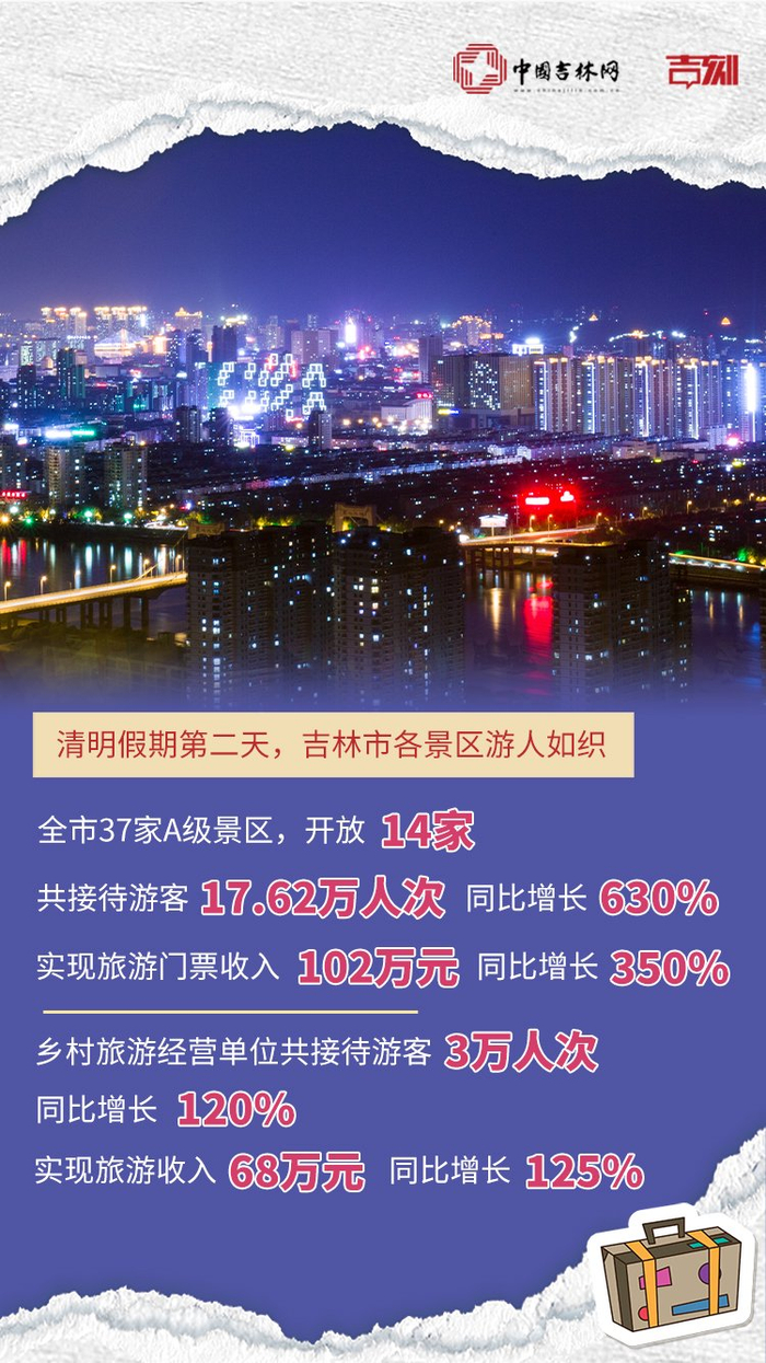 中国吉林网了解到,假期第二天,吉林市37家A级景区,开放14家,共接待游客17.62万人次,同比增长630%,实现旅游门票收入102万元,同比增长350%,乡村旅游经营单位共接待游客3万人次,同比增长120%,实现旅游收入68万元,同比增长125%。
