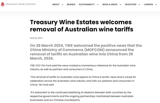3月28日,中国商务部发布终止对原产于澳大利亚进口相关葡萄酒征收反倾销税和反补贴税。富邑集团(TWE,Treasury Wine Estates)第一时间作出回应,在全球官网上发文表示庆祝。富邑集团CEO蒂姆·福特在推文里表示,这是一个重要的里程碑,他认为中国取消澳大利亚葡萄酒进口关税对整个澳大利亚葡萄酒行业以及富邑集团在中国的合作伙伴和消费者都有理由庆祝。