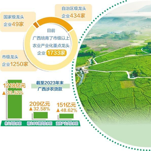 目前,广西培育了市级以上农业产业化重点龙头企业1733家,其中,国家级龙头企业49家,自治区级龙头企业434家,市级龙头企业1250家。自治区级以上农业龙头企业营业收入累计达2950亿元,其中,营业收入破百亿元的有6家,50亿元以上的有9家,10亿元以上的有57家。