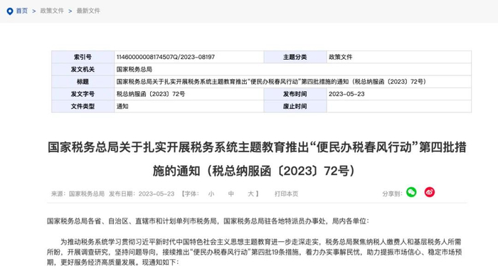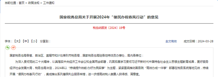 4月2日,国家税务总局发布《国家税务总局关于开展2024年“便民办税春风行动”的意见》。