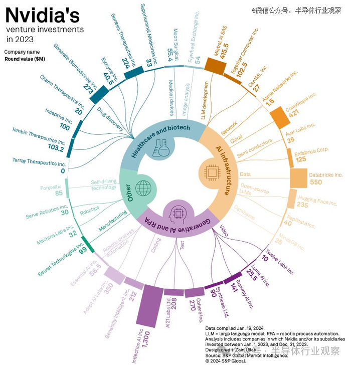 2023年,英伟达投资了大约11家AI基础设施提供商,包括数据分析公司Databricks Inc.,GPU云提供商CoreWeave Inc.和大语言模型提供商Mistral AI SAS,此外,英伟达还投资了像视频生成器Twelve Labs Inc.,聊天机器人创建者Cohere Inc.和机器人流程自动化初创公司Adept AI Labs Inc.这样的生成式AI公司。
