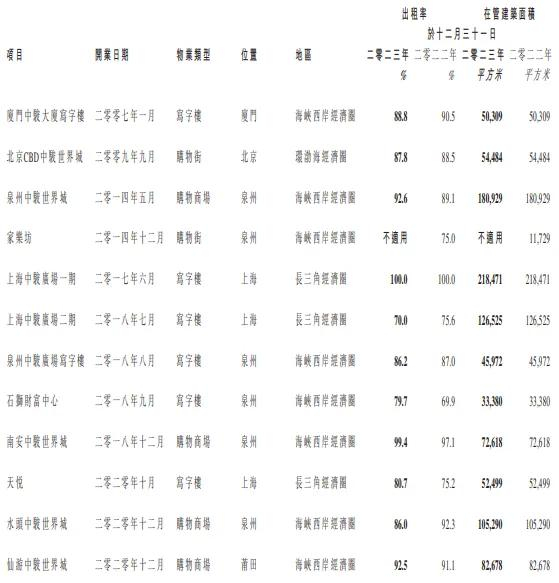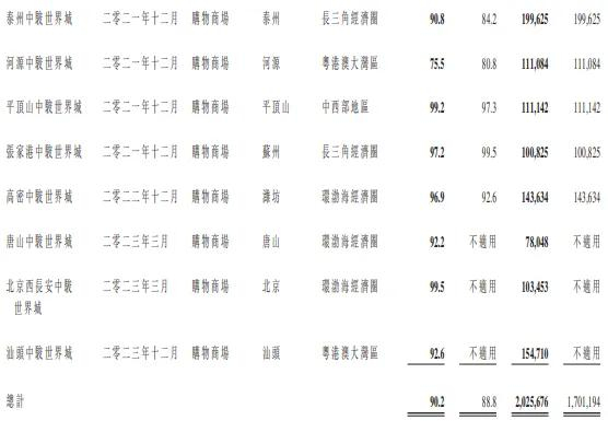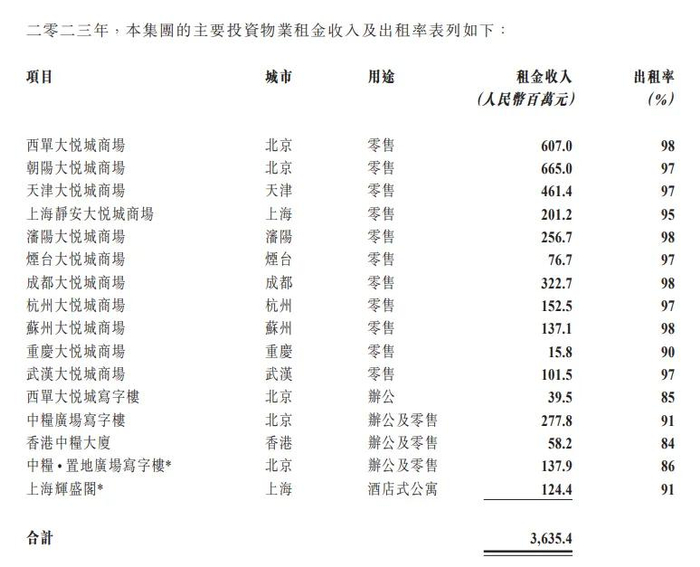 2023年,大悦城地产购物中心业务实现销售额约人民币330亿元,同比增长33%,租金收入录得人民币29.98亿元,较上年人民币21.58亿元增长38.9%。租金收入最高的为朝阳大悦城,租金收入约人民币6.65亿元,出租率达97%。