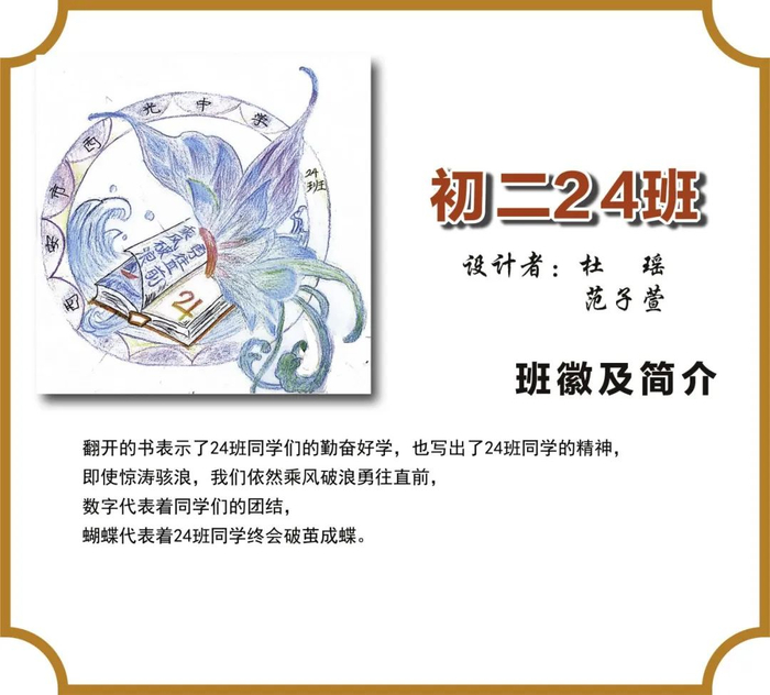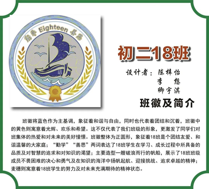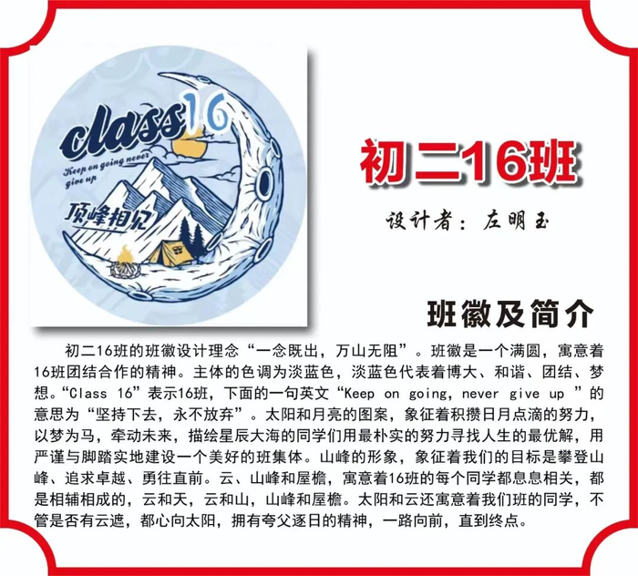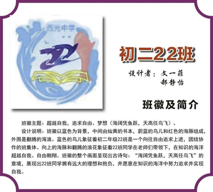 小小的班徽是班级文化的集中表现,它是一种班级风尚,一份文化传统,一个精神载体,它体现着我们的创造力与凝聚力,展现出我们的班级风采。每一个班徽都意义非凡,每一个班级都独一无二。