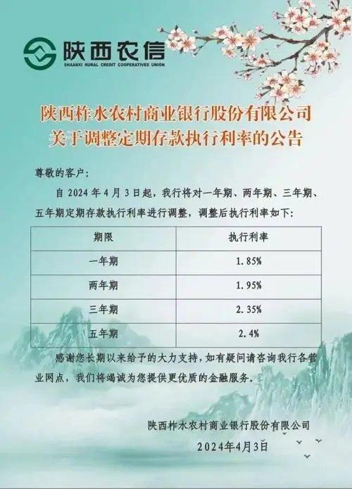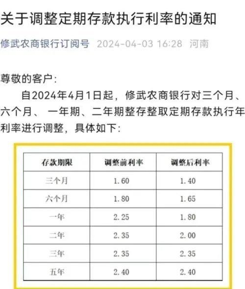记者注意到,4月初,河南、陕西、山西、云南、贵州、广东等地的多家中小银行在官方渠道发布《关于调整定期存款执行利率的公告》,宣布下调定期存款利率,三个月、六个月、 一年期、二年期、三年期等不同期限的整存整取利率均有涉及。