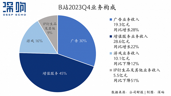 2022年,B站一度出现了广告收入单季度负增长的情况,但从2023年开始增速就重回20%以上。四季度,其广告收入同比增长27.58%至19.29亿元,2023全年广告收入达64.12亿元,同比增长26.57%,广告也成为了B站四大业务(增值服务、广告、移动游戏、IP衍生品)中增速最高的一项。