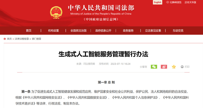 2023年8月15日起施行的《生成式人工智能服务管理暂行办法》第九条规定: