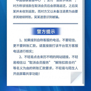 市民吴某接到自称“中国银联服务中心”工作人员的来电,称吴某在抖音开通了“直播带货”会员,如不取消将每月扣费800元。吴某在对方的诱导下下载了“WEBEX”会议APP,通过视频看到身着银行制服的客服,就放下戒心在对方指导下操作,打开屏幕共享功能登录伪造的“中国银联客服中心”,支付“退款手续费”对方称该钱款在取消会员后会原路返还,之后吴某并未收到返款,而对方又以未备注退费为由要求其继续转账,吴某遂意识到被骗。