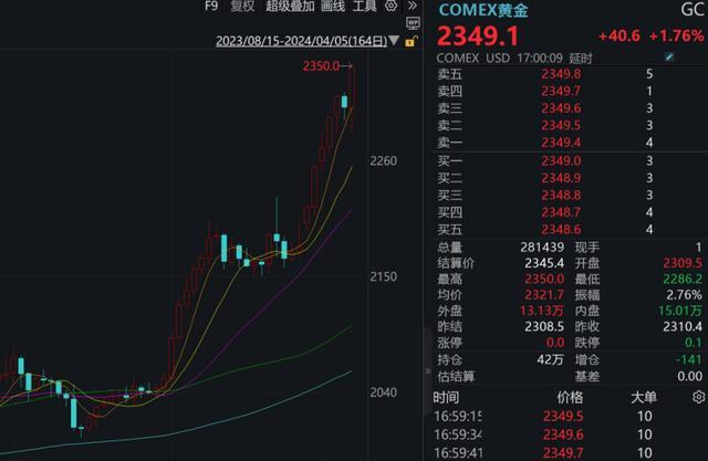 周五晚上金价继续大涨,突破历史新高!Wind数据显示,COMEX黄金大涨1.76%,报2349.1美元/盎司;伦敦现货黄金大涨1.77%,报2329.57美元/盎司。