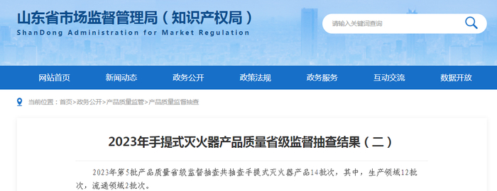 近日,山东省市场监督管理局公布2023年手提式灭火器产品质量省级监督抽查结果(二)。具体信息如下: