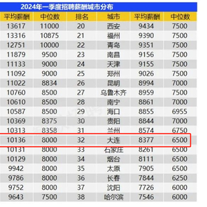 根据《报告》,2024年一季度全国38城企业平均招聘薪酬10323元/月,较去年同期上升2.2%。同时,从招聘薪酬的分位数看,第一季度全国38城企业招聘薪酬中位数为8000元/月。