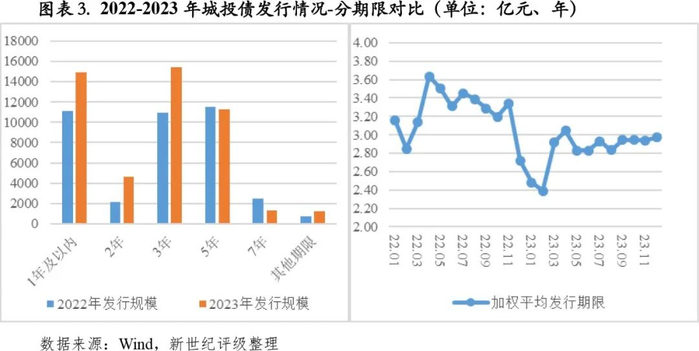 城投债发行期限整体有所缩短。2023年城投债发行加权平均期限为2.86年,短于2022年的3.26年,其中2023年下半年稳定在2.8年-3年之间,且略有拉长趋势。具体看,1年期及以内、3年期和5年期仍为主要发行期限,发行规模分别为1.49万亿元、1.54万亿元和1.13万亿元,较上年分别增长33.5%、40.8%和-1.8%,占总发行规模的比重分别为30.5%、31.5%和23.1%。其中,5年期设置回售条款的债券规模占比达85.7%,较上年提高5.3个百分点。此外,2年期债券发行规模显著上升,2023年为4647.46亿元,较上年增长118.6%。