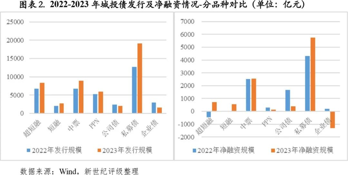 分债券品种看,受私募公司债集中到期等因素影响,2023年城投债各品种中,私募公司债发行量同比增幅最大,其次为短期融资券和中期票据,而企业债受审核权变更影响,发行量较上年同比大幅下降。具体看,2023年城投债银行间品种发行规模合计2.61万亿元,同比增长25.3%,占总发行规模的53.5%,其中超短期融资券、短期融资券、中期票据及定向工具发行量分别为0.84万亿元、0.28万亿元、0.90万亿元和0.59万亿元,同比增速分别为23.4%、36.7%、33.6%和12.9%;城投债交易所品种发行规模合计2.11万亿元,同比增长39.4%,占总发行规模比重从上年的38.9%提升至43.3%,其中公募公司债和私募公司债发行量分别为0.20万亿元和1.91万亿元,同比增速分别为-17.1%和50.2%;城投债企业债品种发行量为0.16亿元,同比下降46.4%,占总发行规模的3.2%。净融资方面,城投债银行间品种净融资规模为0.40万亿元,较上年0.23万亿元显著提升,具体品种间差异较大,其中超短期融资券和短期融资券的净融资额较上年显著增长,中期票据基本与上年持平,定向工具净融资同比降幅在60%左右;城投债交易所品种净融资规模为0.62万亿元,较上年同期0.60万亿元略有增长,主要受私募公司债净融资规模增长拉动;企业债为唯一净偿还券种,2023年净融资规模为-0.13万亿元。