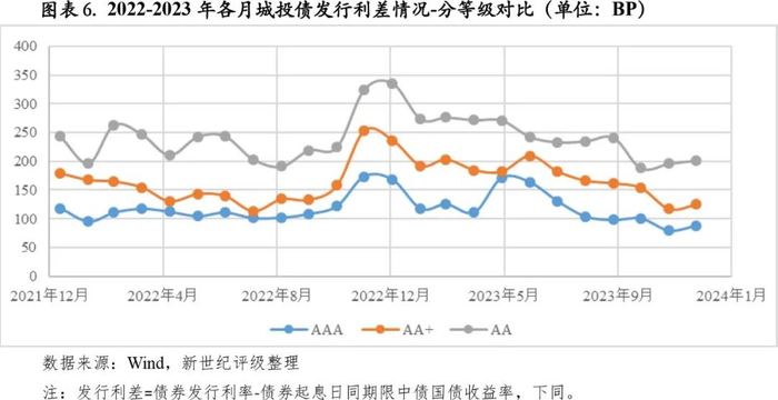 利差方面,由于部分期限城投债发行支数较少,新世纪评级选取发行的期限为0.75年、1年、3年和5年(剔除增信及永续条款债券)的共4341支城投债作为城投债发行利差研究样本。从发行利差走势看,2023年城投债市场经历了两轮利差下行,1-7月的第一轮利差下行主要为理财集中赎回潮结束后形成的信用修复,8-12月的第二轮利差下行主要为化债行情。具体看,主体信用等级为AAA级的城投债发行利差修复情况最好,在2月已基本回落至去年水平,面对化债行情,AAA级城投债发行利差亦率先下降,第四季度发行利差均值为89BP,低于2022年平均水平26BP;AA+级及AA级第四季度发行利差均值分别为133BP和196BP,分别低于2022年平均水平22BP和41BP。