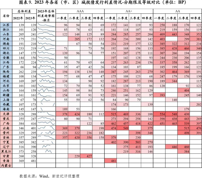 进一步分等级看,一揽子化债政策对尾部地区高等级城投更利好,天津、吉林、云南和贵州第四季度AAA级城投债发行利差分别较第二季度收窄312BP、263BP、180BP和141BP,收窄幅度大于同区域AA级城投债。具体看第四季度发行利差,AAA级城投债发行利差均值大于150BP的省份为云南、贵州和吉林,陕西、河南和天津发行利差超100BP;利差明显收窄的省份为天津、吉林和云南,较第一季度下行幅度超150BP。AA+级利差均值大于200BP的省份为广西、云南、贵州、陕西、宁夏和山东,其中广西AA+级城投债发行利差(422BP)为各区域最高,云南为375BP;利差显著收窄的省份为天津,较第一季度收窄327BP,重庆、新疆、宁夏、河南、山西、湖南、福建和安徽利差收窄幅度超100BP。AA级利差均值大于300BP的省份为云南、广西、贵州、河南、山东和四川,重庆、湖南和西藏发行利差超200BP;新疆、江西、湖北和湖南AA级城投债发行利差收窄相对明显。
