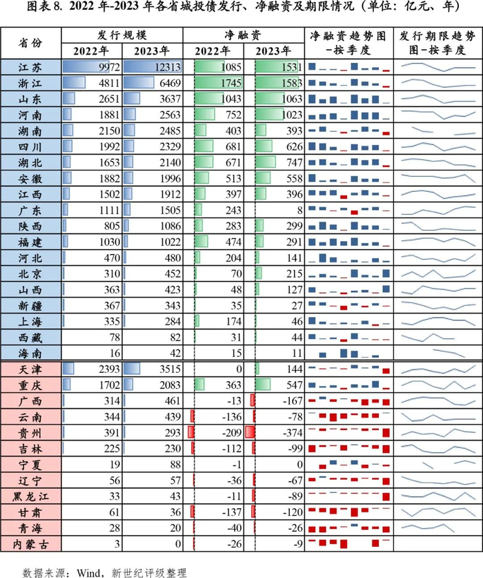 从净融资情况看,2023年共有21个省份城投债实现净融资,其中浙江以净融资1583亿元领先,江苏以1531亿元紧随其后,山东和河南净融资分别为1063亿元和1023亿元;湖北、四川、安徽、重庆净融资超500亿元;江西和湖南接近400亿元,陕西和福建接近300亿元;北京、天津、河北和山西净融资超100亿元;相较于2022年,江苏、河南、重庆、北京、天津净融资增量相对较大,而广东、福建、浙江净融资增速放缓。10个省份城投债延续净偿还状态,其中贵州、广西和甘肃净偿还规模分别为374亿元、167亿元和120亿元;吉林、黑龙江、云南和辽宁净偿还规模在50-100亿元之间;青海、内蒙古和宁夏净偿还规模相对较小。近两年,城投债净偿还地区主要集中在12个高风险重点省份,而2023年第四季度以来,受城投债发审政策收紧及特殊再融资债券发行影响,江苏、浙江、湖南、湖北等部分非重点省份也呈现净偿还状态。