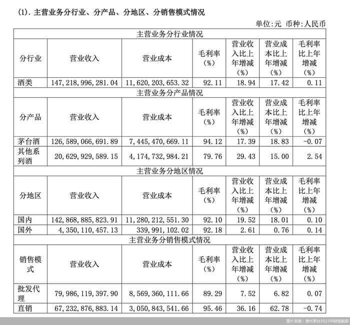 2023年,贵州茅台旗下酒类产品实现营业收入1472.19亿元,同比提升18.94%。其中,贵州茅台旗下茅台酒、其他系列酒实现营业收入1265.89亿元、206.3亿元,同比提升17.39%、29.43%。