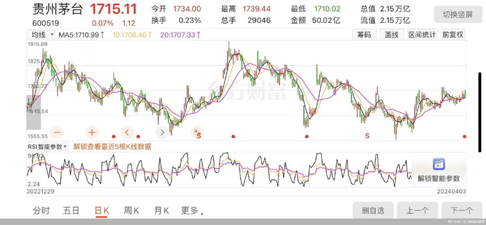对于白酒板块而言,贵州茅台不仅是终端市场活跃度的晴雨表,同时也是中国股市风向标。清明节前最后一个交易日(4月3日),贵州茅台以1715.11元/股收盘,微涨0.07%,总市值达2.15万亿元。