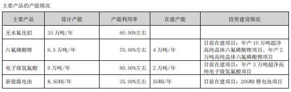 据多氟多透露,公司新能源材料核心产品是以六氟磷酸锂(LiPF6)及其他多种新型锂盐为代表的电解质材料,为锂电池电解液的关键材料之一。目前,多氟多六氟磷酸锂的设计产能6.5万吨/年,产能利用率70%左右,在建项目有两个,分别是年产10万吨超净高纯晶体六氟磷酸锂和年产2万吨高纯晶体六氟磷酸锂项目。