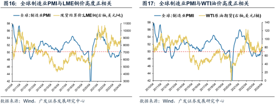 路径一:全球制造业的复苏,意味着部分全球定价的工业品供需格局改善、价格上涨。下图显示,以铜、原油为代表的全球工业品及资源品价格走势与全球制造业PMI高度相关。因此在全球制造业的复苏周期,A股相关全球定价的上游资源行业因涨价预期而股价受益(工业金属/石油石化)。