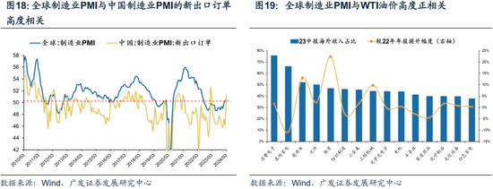 其次,由于中国制造业的出口敞口较大,因此全球制造业PMI改善意味着中国出口链制造业的需求复苏,从而观测到中观数据的订单及收入验证,带动相关行业的股价表现。下图可见,全球制造业复苏与中国PMI新出口订单高度正相关,从而进一步对中国制造业PMI整体、以及中国出口敞口较大的制造业订单和收入预期产生正向支撑。
