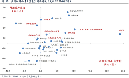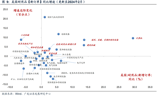 其次,美国耐用品需求回暖、补库周期开启:也是驱动制造业景气度回升的另一重要因素。从耐用品的新订单来看,计算机、工业机械、建筑机械、家具及相关产品、铝和有色金属等行业的新订单增速回暖较明显。