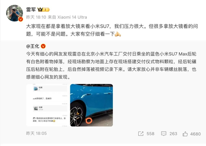 小米创始人、董事长雷军随后转发了王化的微博表示,“大家现在都是拿着放大镜来看小米SU7,我们压力很大。但很多拿放大镜看的问题,可能不是问题。大家有空仔细看一下”。