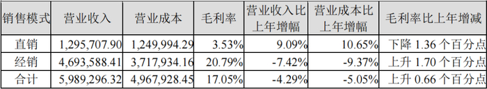 截至2023年12月末,该公司共有经销商23570家,年内净增加3632家,增幅为18.22%。但在经销商数量增加的同时,经销模式收入却出现下滑。而收入呈现增长趋势的直销模式,毛利率却偏低,仅为3.53%;经销毛利率为20.79%。