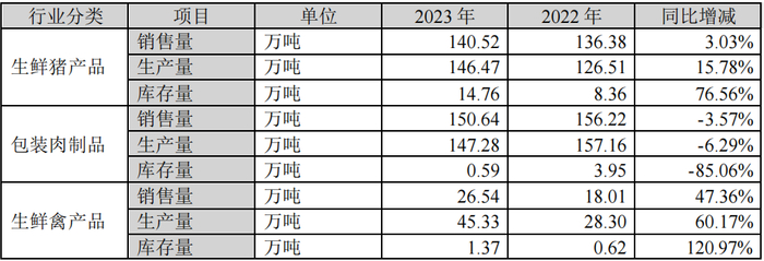 相反,该公司包装肉制品在2023年的库存量为0.59万吨,同比下降85.06%。其表示,主要原因是2022年末离春节较近,公司适当增加备货,2023年末无此因素影响。