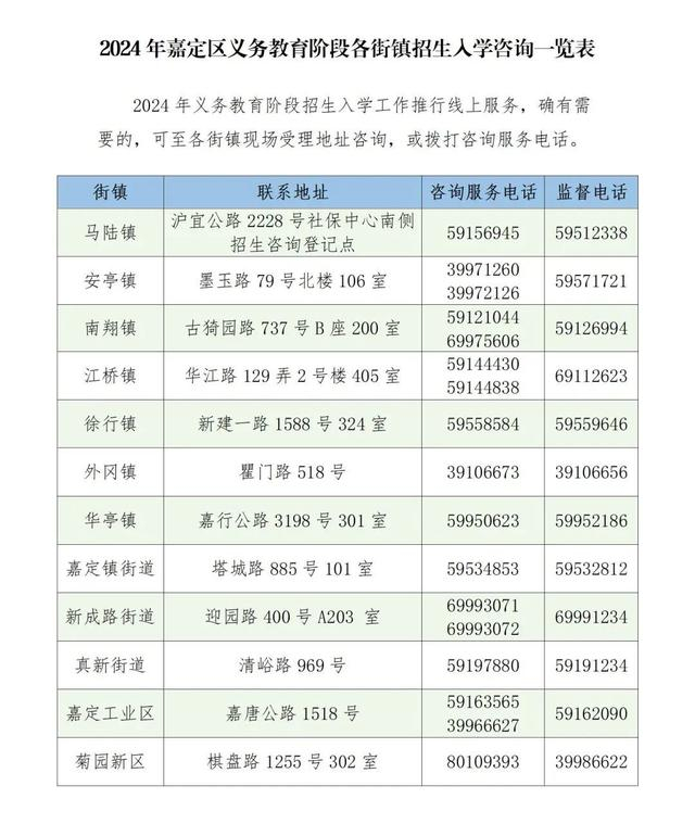 各街镇向社会公布如下信息:关于本街镇义务教育阶段招生入学工作的实施方案及招生入学具体工作事项,包括入学统筹细则、学校对口招生的划片范围、招生方式;入学咨询和监督举报电话。