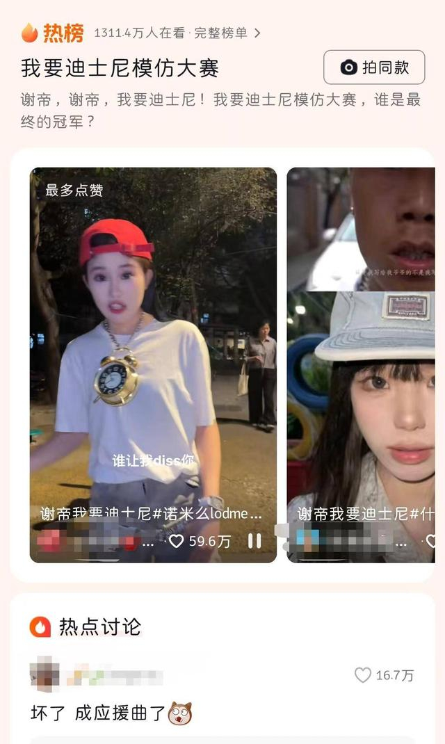 这首歌在网上病毒式的传播并不完全因为歌曲本身,而是因为网友玩梗,一开始是有网友玩梗说“谢帝是他家长吗,要带他去迪士尼”逗乐了不少人,随后更多人参与到了“谢帝我要迪士尼”玩梗当中,加上这个MV的中二气质和诺米么在健骑机上的动作引人发笑,“谢帝我要迪士尼模仿大赛”开始成为短视频平台新一轮模仿视频热点,抖音上“我要迪士尼模仿大赛”在看人数已超1300万,拍摄同款视频的博主中有不少得到了四五十万的点赞,流量惊人。