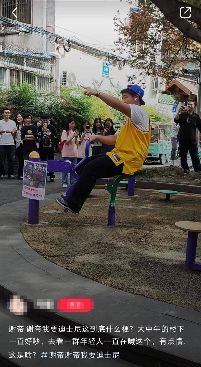 这地方到底咋火的?事情要追溯到说唱歌手诺米么了,说唱歌手诺米么此前在社交平台名气不大,粉丝数大约刚刚过千,他参加了《新说唱》的海选但是没能通过,审核官谢帝建议他把说唱当个爱好算了,诺米么不服气,写了首歌《谢天谢帝》来diss(网络用语,轻视、鄙视之意)谢帝,还到玉林八巷小区拍了个多少有点粗糙的MV,这首歌的副歌一直在重复“谢帝,谢帝,我要diss你”,发音听起来很像是“谢帝谢帝我要迪士尼”,因为内容无厘头且洗脑,因此在网上走红成为了新的网络流行语,在MV中,诺米么坐在健骑机上唱歌,所以MV拍摄地玉林八巷小区的健骑机成为了网友指定打卡地点,网友们模仿诺米么MV里的姿势拍照打卡,这个地方也被戏称为“成都迪士尼”。