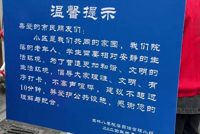成都武侯区玉林街道玉林八巷小区居民可能怎么也想不到自家楼下的健骑机会成为网红打卡地,拍照的、打卡的、直播的人流把这个小的巷子挤得水泄不通,4月6日下午,为了维护现场秩序,玉林派出所安排工作人员对这块地方进行限流管理,“目前现场人比较多,不建议前去打卡,有可能因限流而无法入内。”玉林派出所工作人员还表示,最近两天接到几十位居民投诉,未来一段时间会继续限流,控制小区内的人数,以免造成困扰。现场已设立了提示牌,强调有序打卡,据当地居民拍摄的照片显示,该地目前可以拍照打卡但是不可高声喧哗。