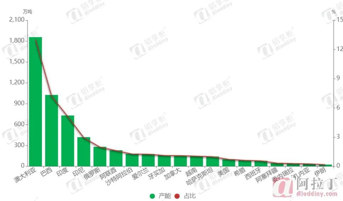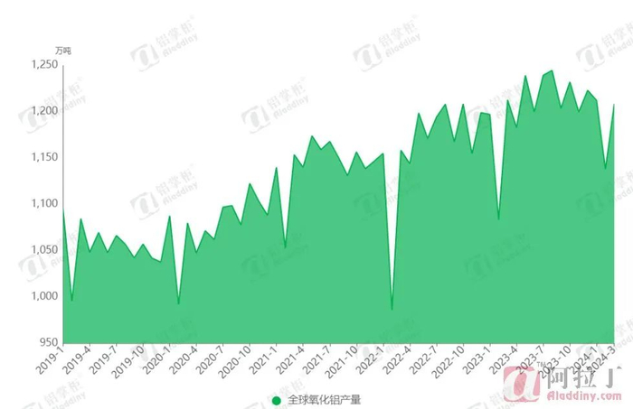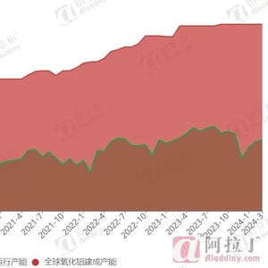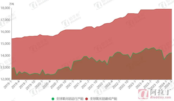 根据阿拉丁(ALD)的初步统计数据,2024年3月全球氧化铝建成产能17919.80万吨,与上月相比无新增产能,截至3月末,除中国外全球其他国家总建成产能为7577.80万吨,与上月相比全球没有新增产能的出现。