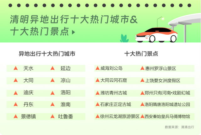 清明假期,前往旅游景点的打车需求同比去年上涨92%。大同云冈石窟、郑州只有河南·戏剧幻城、上饶婺女洲度假区、潍坊青州古城、洛阳隋唐洛阳城遗址公园、惠州罗浮山景区、石家庄正定古城、西安秦始皇兵马俑博物馆、徐州云龙湖旅游景区、威海刘公岛成为今年清明十大热门景点,打车需求同比去年上涨均超过6倍,其中前往云冈石窟的滴滴打车需求同比去年上涨超20倍;只有河南·戏剧幻城、婺女洲度假区的打车需求同比去年分别上涨13倍、12倍。