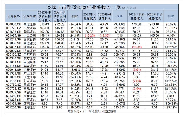 2023年行业整体佣金和手续费收入全面下滑,自营业务收入成为业绩抗跌的关键。