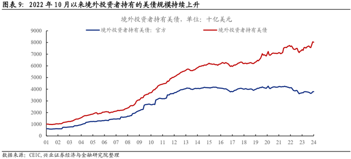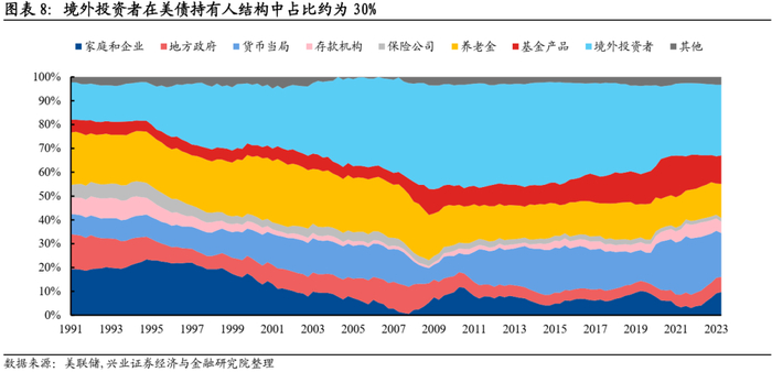 美债和黄金都属于全球安全资产,但美债的地位被黄金取代不太现实。境外投资者是美债占比最高的持有人类别,2022年10月以来境外投资者持续买入美债。如果黄金价格上涨背后是美元资产被抛弃,那如何解释境外投资者持有的美债规模不断创新高呢?目前境外官方机构持有美债规模相对平稳,境外私人机构是买入美债的主力。全球黄金存量大约为20.9万吨,价值约13万亿美元。其中一半为流通性较差的黄金首饰,真正的黄金市场规模约为5万亿美元,主要由金条、金币、黄金ETF、央行黄金储备等构成。而美债存量超过33万亿美元,美债市场规模远大于黄金,其金融属性和流动性也远好于黄金。目前仅境外投资者持有的美债超过8万亿美元,已经超过黄金市场的规模。