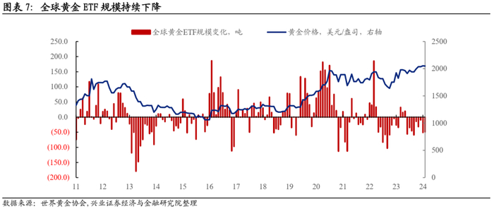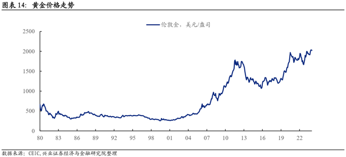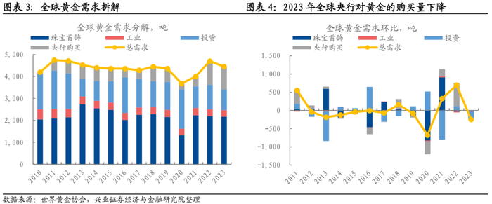 全球央行购金需求上行最大的年份是2022年,2023年全球央行购金边际上已经回落。2022年2月俄乌冲突爆发,随后欧美对俄罗斯实施金融制裁,将货币武器化。2022年全球央行对黄金购买量大幅上升合情合理。2023年全球央行对黄金购买量维持在高位,但相比2022年小幅回落。从金价表现上看,2022年黄金价格整体下跌,这说明全球央行购金并未对金价起到支撑作用,而是黄金定价的经济逻辑—实际利率—在发挥作用。2023年黄金价格上涨有很多合理解释,比如硅谷银行和瑞士信贷事件引发市场震荡,投资者对美国衰退的担忧升温等,全球央行购金并不是唯一原因。全球央行购金行为对黄金价格有一定解释力,但我们不应该将其归因为最主要的原因甚至是唯一原因。