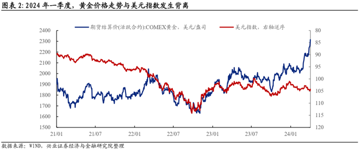 黄金是今年一季度表现最偏离“常识”资产。全球宏观一季度表现可以用“软着陆路径的强化”来概括,美国基本面和通胀数据持续超预期,欧洲和日本的基本面也好于预期。2023年萦绕在投资者心头的衰退担忧逐渐消散。美联储降息时点后延,美股不断创新高,美债收益率曲线上移,美元走势偏强,都是对美国经济“软着陆”的定价。黄金价格走势与其他资产出现背离,常规框架下,如果美国宽松预期后移,名义利率上行叠加美元走强,黄金价格应该下跌。美国通胀趋势下行以及中期衰退和金融危机的概率下降,也会导致黄金保值和避险的功能削弱。但我们所看到的是黄金价格不断创下新高。实际上2022年以来,实际利率对金价走势的解释力就已经下降,当下流行的叙事是用“美元信用体系的坍塌”来解释黄金定价范式的转变。真的如此吗?