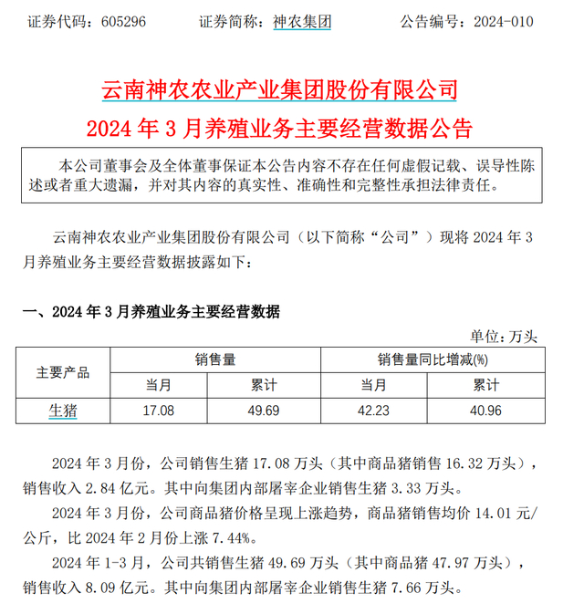当晚,神农集团(605296)同样披露,3月该公司销售生猪17.08万头(其中商品猪销售16.32万头),销售收入2.84亿元,同比增长42.23%。其中向集团内部屠宰企业销售生猪3.33万头。