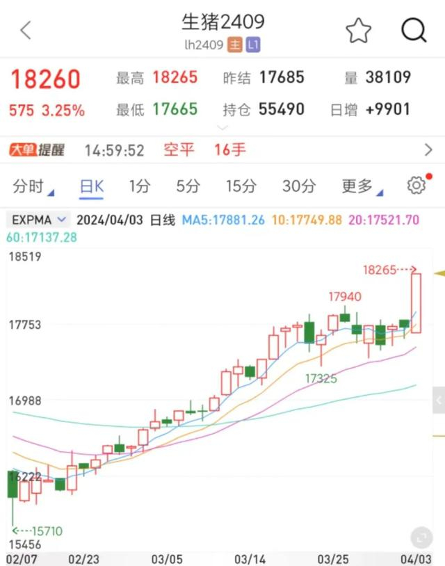 而在期货市场,生猪期货主力合约2409出现显著上行,4月3日单日涨幅达3.25%,达到18265元/吨的近一年高点,较2月初15710元/吨的阶段低点已上涨超16%。