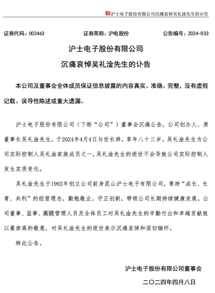 沪电股份在讣告中表示,吴礼淦先生于1992年创立公司前身昆山沪士电子有限公司,秉持“成长、长青、共利”的经营理念,勤勉敬业,守正创新,带领公司长期持续健康发展。公司董事、监事、高级管理人员及全体员工对吴礼淦先生的辛勤付出和卓越贡献致以最崇高的敬意,对吴礼淦先生的逝世表示沉痛哀悼和深切缅怀。