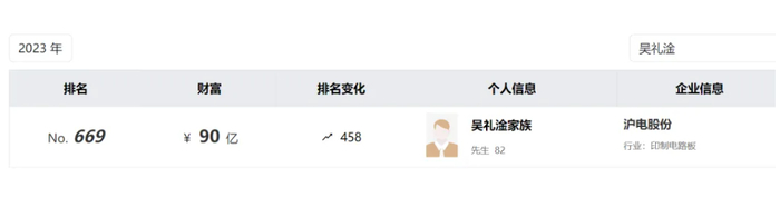 2020年,吴礼淦家族以100亿元人民币财富名列《胡润全球富豪榜》第2000位。2023年,吴礼淦家族以90亿元的财富名列《胡润百富榜》第669位。