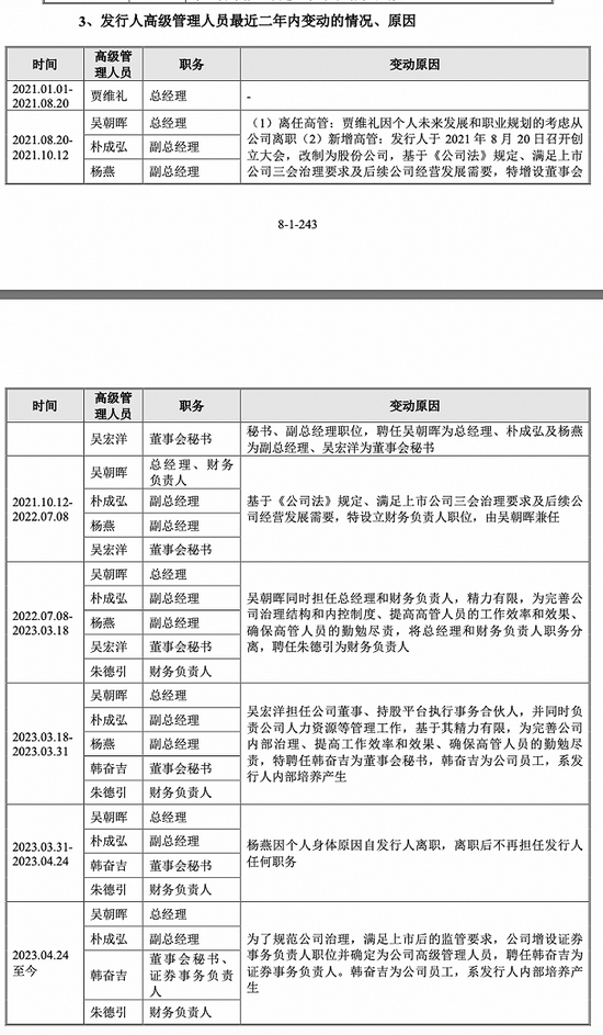 例如,历任董事、总经理的贾维礼因个人未来发展和职业规划的考虑从公司离职;历任副总经理杨燕因个人原因离职;实控人之一的吴宏洋卸任公司董秘等。