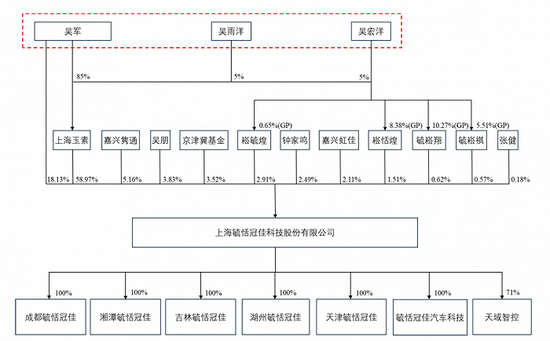 目前,毓恬冠佳主要由吴家人控制,吴军、吴宏洋及吴雨洋(后两人为吴军之女)通过直接及间接方式合计控制公司82.70%的股份。另外,吴军的配偶李筱茗,持有控股股东上海玉素5%股权;吴军的胞弟吴朋,持有公司3.83%的股份,两人为实控人的一致行动人。