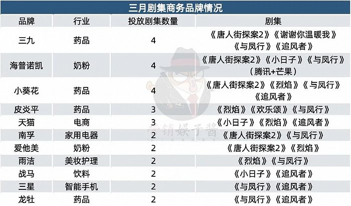 根据娱乐资本论统计,3月播出剧集中,共11个品牌投放数量超过两部。其中,药企仍是广告投放的高频行业,共四个品牌上榜,分别为:三九、小葵花、皮炎平与龙牡,皆是近来的投放常客。奶粉企业仅次之,共两个品牌上榜,包括了海普诺凯和爱他美。