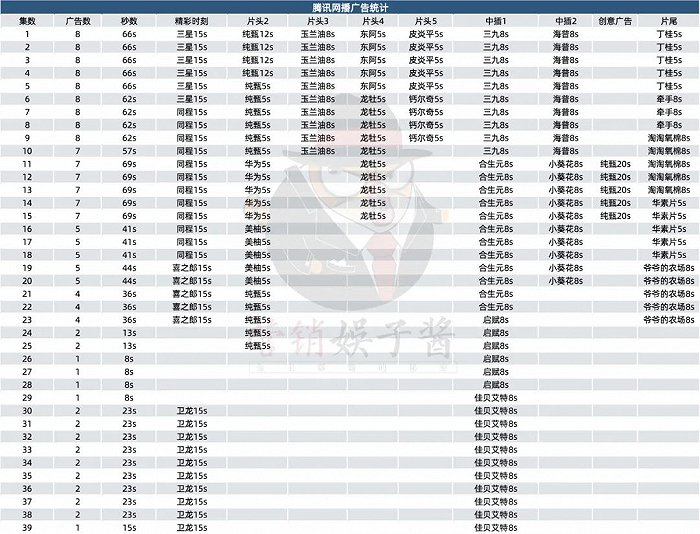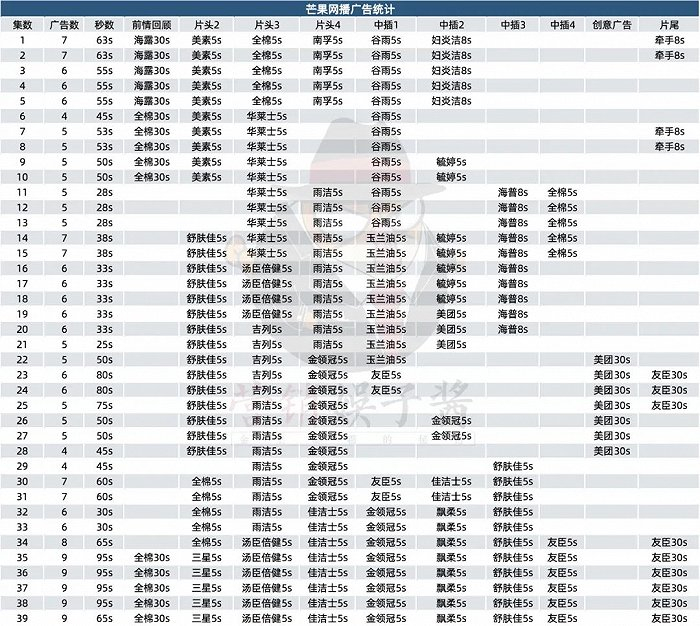 《与凤行》为腾讯平台定制剧,必然提前做好大动作。该剧前九集均是满广,每集拿下8个广告,集均广告时长超过1分钟。而且腾讯还获得了纯甄的独家冠名,也是腾讯首部以联播形式拿下独家冠名的剧集。而芒果则主要在中后期发力。尤其是22集之后,增加7集美团30秒的创意广告,以及3集友臣30秒的片尾广告。